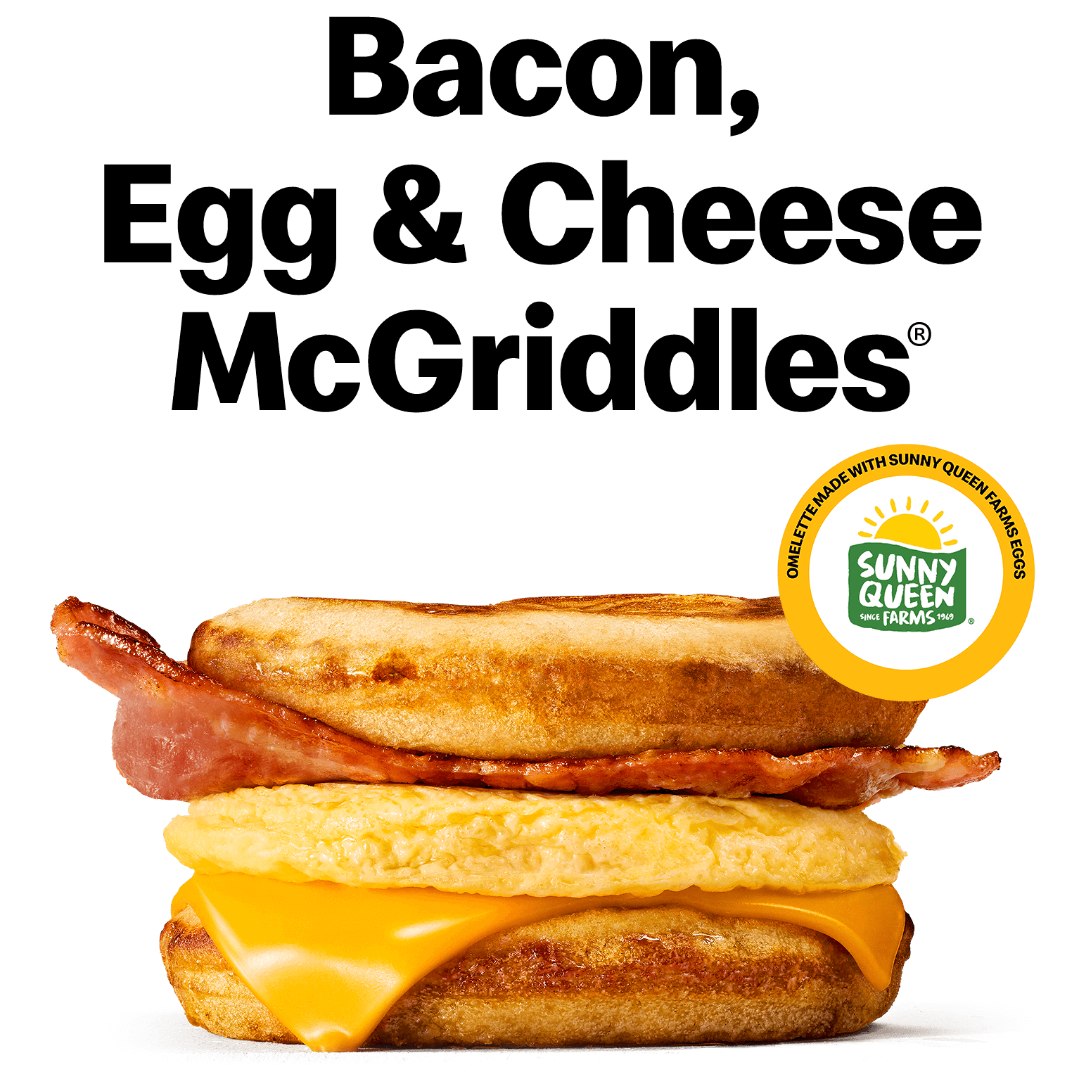Rasher bacon, a fluffy omlette egg made with Sunny Queen Farm Eggs and a slice of melty cheese between two soft, warm maple infused pancakes.