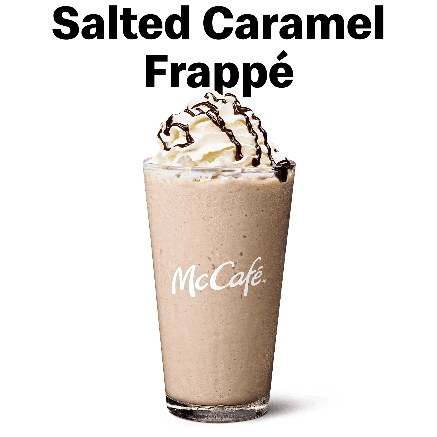A perfectly balanced Salted Caramel Frappé topped with whipped cream and chocolate drizzle.