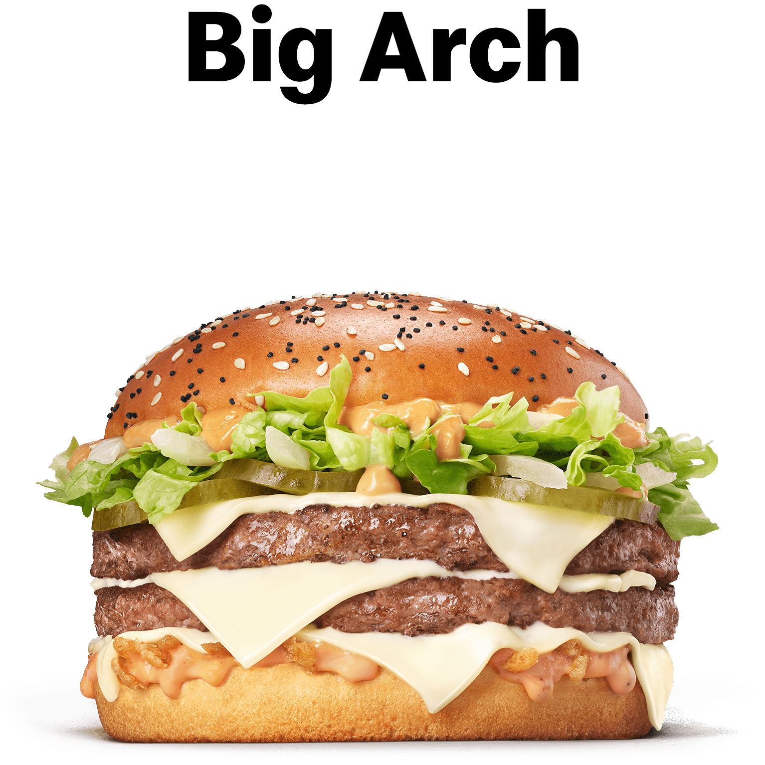 Two 100% Aussie beef patties, stacked with three layers of white cheddar cheese, crispy onions, slivered onions, pickles, fresh lettuce, and our signature Big Arch sauce. All served on a perfectly toasted sesame and poppy seed bun.